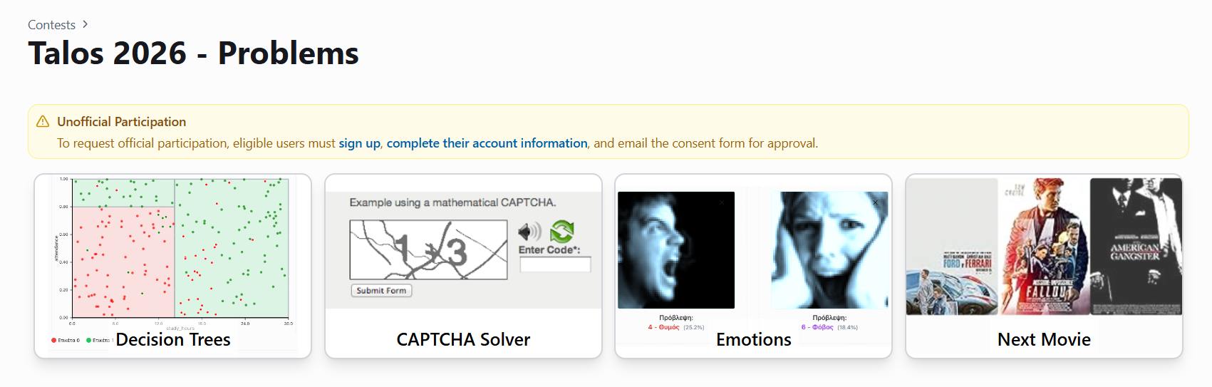 The Preliminary Phase "Talos" of the Greek Olympiad in Artificial Intelligence (PDTN) is now open for online participation. This competition for middle and high school students will run from December 1, 2025 until March 1, 2026, and students will be asked to solve four problems: one on Decision Trees (ฮฮตฮฝฯฯฮฑ ฮฯฮฟฯฮฑฯฮทฯ), one on CAPTCHA Challenges (ฮฯฮฏฮปฯ ฯฮท CAPTCHA), one for Emotion Classification (ฮฃฯ ฮฝฮฑฮนฯฮธฮทฮผฮฑฯฮฑ), and one on Movie Recommendation Systems (ฮฯฯฮผฮตฮฝฮท ฮคฮฑฮนฮฝฮฏฮฑ).